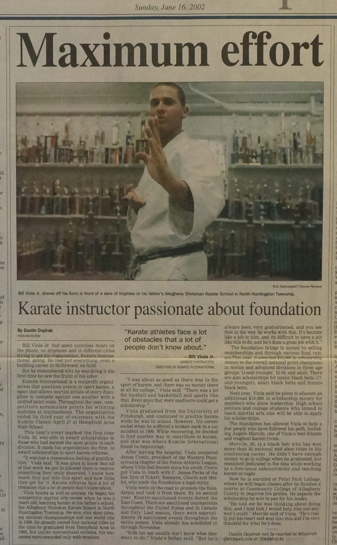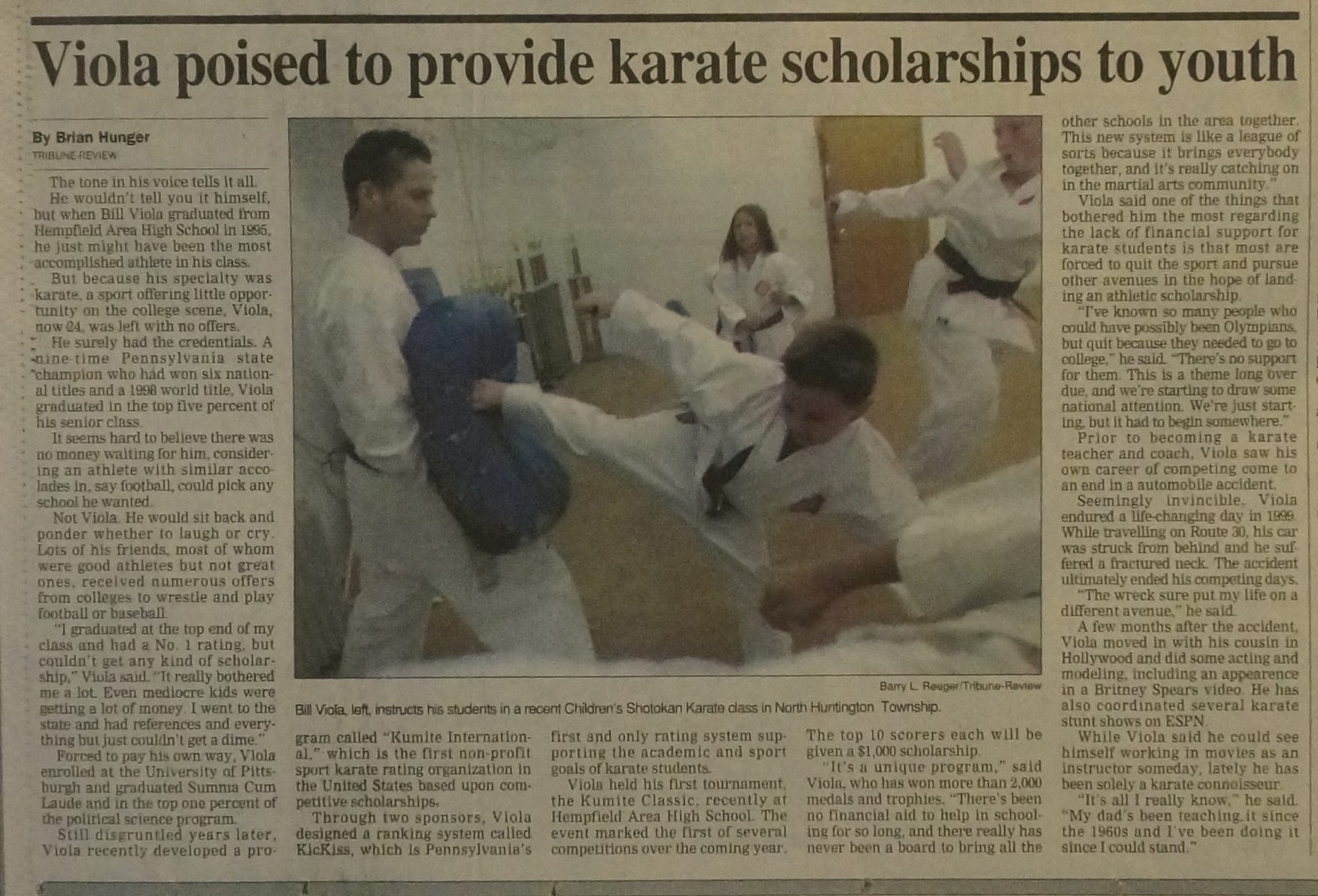 Team Kumite: (today) Sensei Bill Viola Jr. founded the all-star sport karate team to promote the newly minted scholarship foundation and bring back the storied tradition of the X-Caliber karate team. The team would single-handedly put Pittsburgh back on the sport karate map winning an unprecedented amount of world titles. Team Kumite was active as a dojo team as early as 1999, but opened the doors with official team tryouts in 2002.